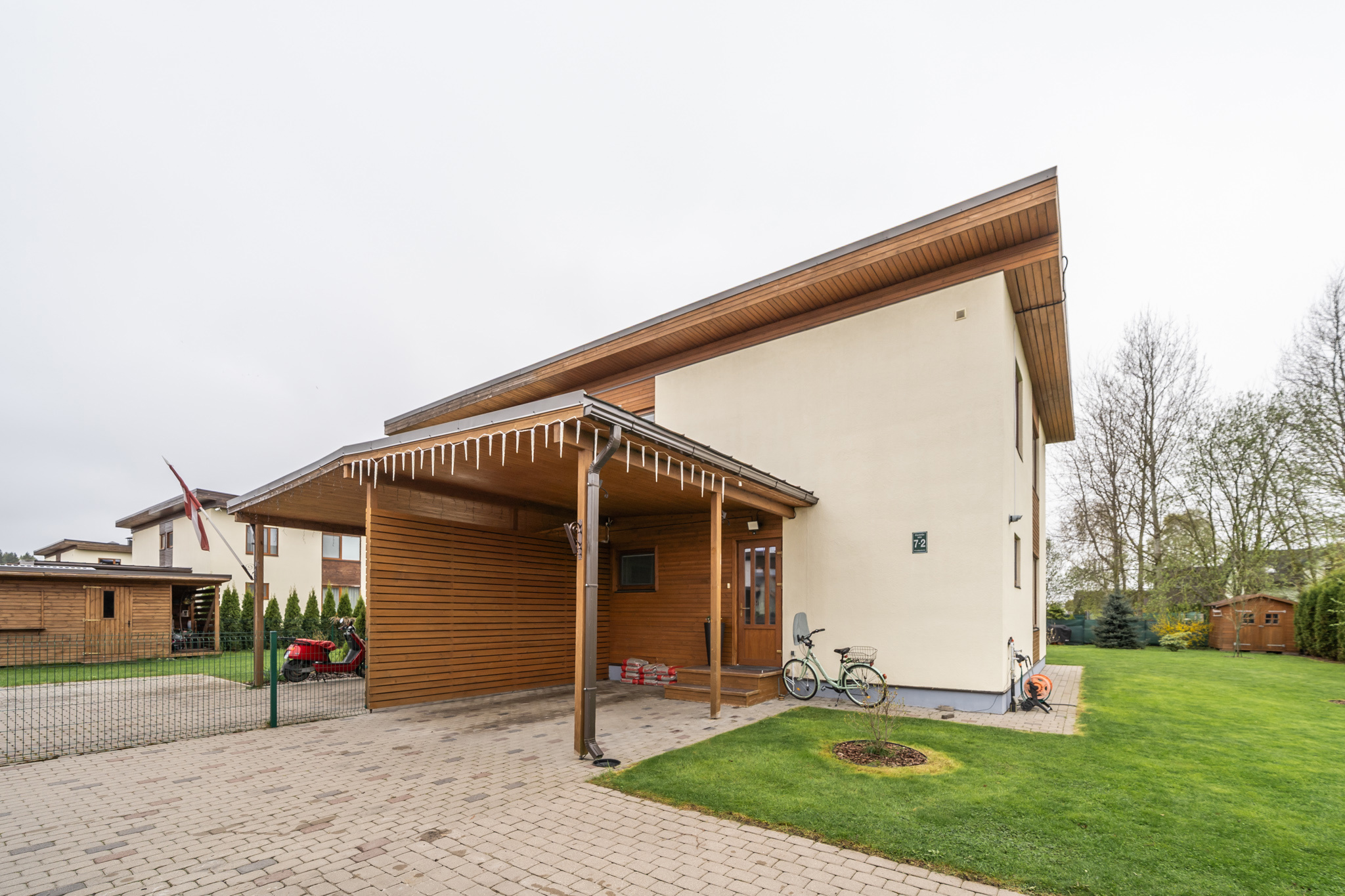 Pārdod skaistu, labi koptu privātmāju ar iekoptu pagalmu un šķūnīti – gatava dzīvošanai! Piedāvājumā mājīga un funkcionāla māja ar pārdomātu plānojumu, kas piemērota ģimenes ikdienas vajadzībām. Plānojums: 1. stāvs: priekštelpa, saimniecības telpa, WC, plaša halle, virtuves zona (ar iebūvētu virtuvi, cepeškrāsni, trauku mazgājamo mašīnu, ledusskapi), apvienota ar dzīvojamo istabu, no kuras ir izeja uz privātu terasi. 2. stāvs: trīs izolētas istabas un atsevišķa vannas istaba. Tehniskā informācija: Gāzes apkure ar individuālu skaitītāju, Autonoms apkures katls, Pirmajā stāvā – apsildāmās grīdas un radiatori, otrajā stāvā – radiatori, Centrālā kanalizācija, Optiskais internets. Ciemata priekšrocības: Labiekārtota un attīstīta infrastruktūra, Asfaltētas, apgaismotas ielas, Bruģēti un apzaļumoti piebraucamie ceļi līdz māju sekcijām. Ideāla izvēle tiem, kas meklē komfortablu un gatavu mājokli sakoptā un drošā vidē!